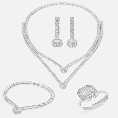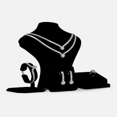- يتميز الطقم بتصميمه الذي يتزين بحليه بشكل هندسي تتزين بفصوص من الزركون اللامع